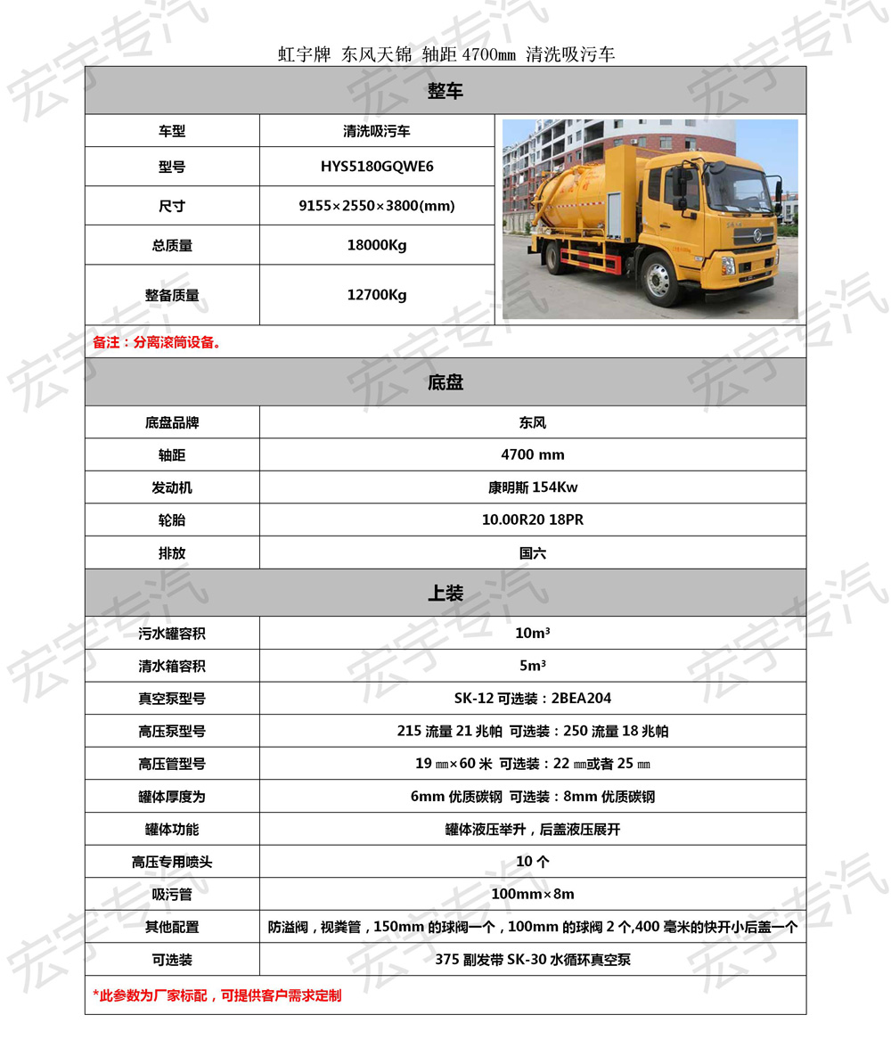 | 虹宇HYS5180GQWE6清洗吸污车底盘参数 | |||