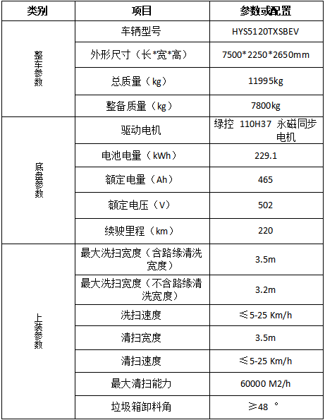 | 虹宇HYS5120TXSBEV纯电动洗扫车主要技术参数 | |||